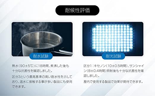 高耐久性】「耐水区分3」90℃×16時間 熱湯に入れた後の抗菌性を確認。温水に接触可能です。「耐光区分1」キセノン8時間、サンシャイン10時間照射後の抗菌性を確認。屋内で使用可能です。※上記の耐久性を確認していますが、使用状態によっては汚れ等により性能が低下するおそれがあります。【安全性】 日本食品衛生法、FDA(アメリカ)、GB(中国)に適合。